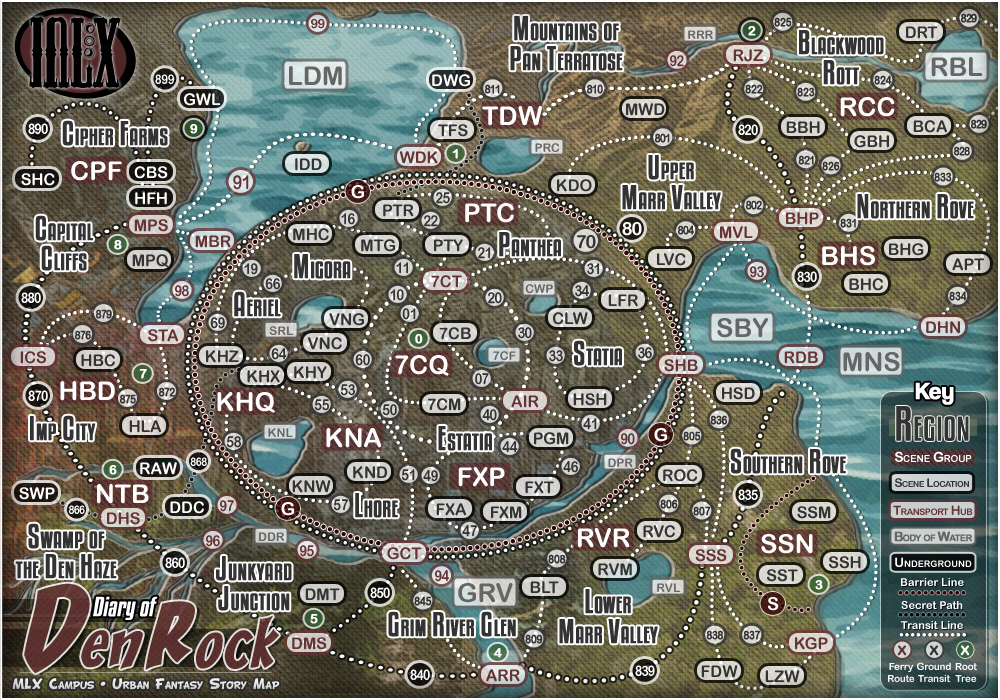 A Kindren Mission Campus is a mapped region featuring a central "Yard" surrounded by multiple outer Yards and designed around its major roadways. Each Campus is identified by a 3-letter Campus Code, hence this story's fictional urban setting has been given "MLX" as its Code. The central Yard of the MLX Campus is a shielded interior-city called "Miracle Rock" while its 10 surrounding districts are known as the "Dim Dires".